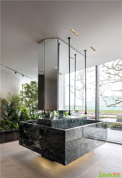 盥洗區(qū)漂浮的綠色洗手臺(tái),懸吊式水滴龍頭,洗手臺(tái)一旁種滿了綠意蔥蔥的植物,售樓中心設(shè)計(jì)任何一個(gè)空間都不忘營(yíng)造自然生態(tài)的體驗(yàn)。