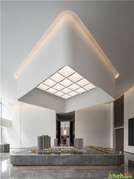 沙盤區(qū)中心明確,視覺不需要出現(xiàn)過多干擾之物,營銷中心設計師用統(tǒng)一的單色石材確定了干凈、簡潔的立面控制。天花造型吸取了古代建筑中“藻井”的特點,設計師采用現(xiàn)代化的藝術處理方式呈現(xiàn),以具有分量感的體塊結合略帶溫暖的燈光,將空間梳理地輕重有別,自然而純粹。
