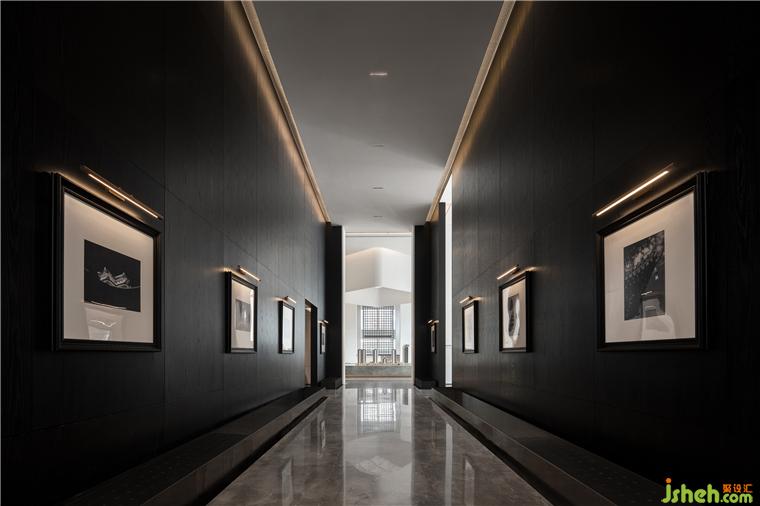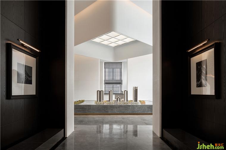 越過沙盤深入中庭,需經過一段悠長的走廊。營銷中心設計師有意在此降低明度,以深色的界面包裹空間,深邃、肅穆……心理感受產生變化。裝點于墻上的黑白古建筑攝影作,增強了室內的藝術內涵與氣息。人們在行進的過程中可一覽太原古城的魅力與豐贍。
