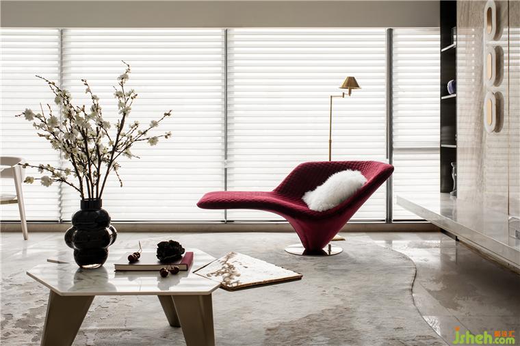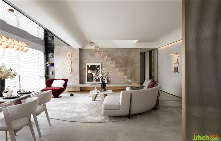 大橫廳全落地窗盡攬室外風(fēng)景。沙發(fā)的造型及擺放方式是靈活且具有趣味感的,配合一張圓形地毯更增添了空間的圓潤度、輕盈感。