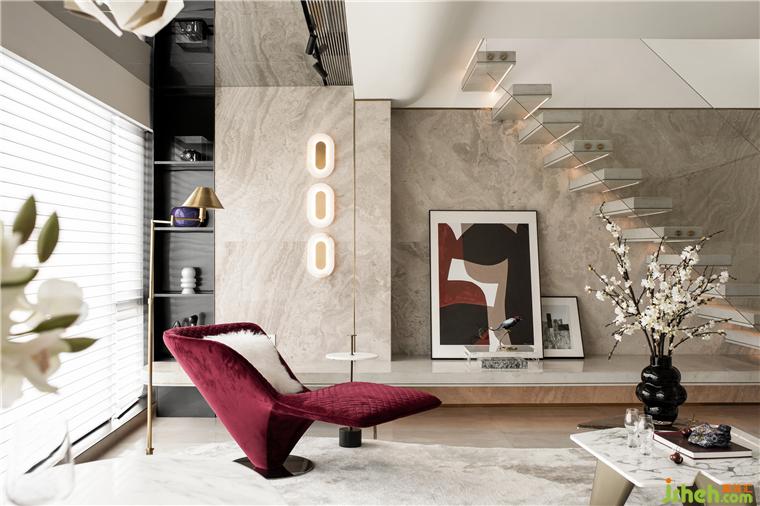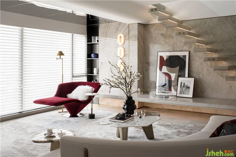 隱形的超白玻欄桿,石材作為踏步,直接展示了梯步的材料和形狀,樣板房設(shè)計(jì)具有輕奢感的樓梯成為空間的立體“雕塑”。