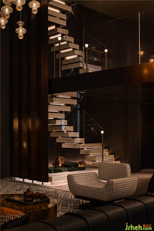 碩長(zhǎng)的藝術(shù)吊燈傾墜而下,串聯(lián)雙層空間,舒展之姿極具視覺(jué)張力。它在一個(gè)充滿昂貴材料和高級(jí)家具的地方如此契合,為空間增色。