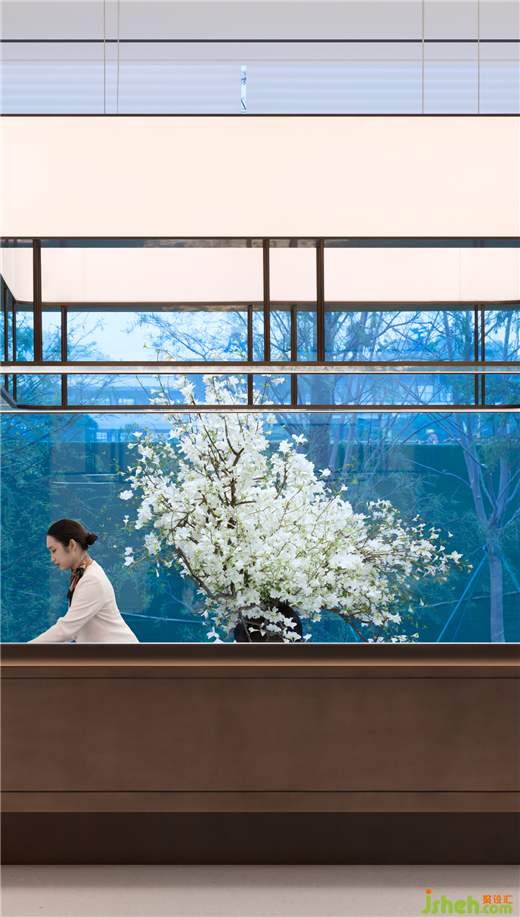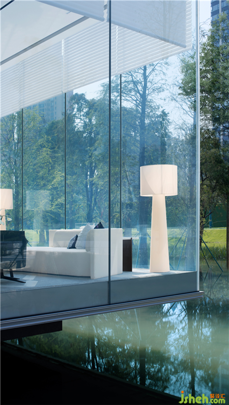 項目原場地未來屬于城市生態(tài)公園,樹木、湖水、陽光,生機(jī)盎然的園林室內(nèi)依托室外景觀帶,順德悅府示范區(qū)設(shè)計以“親水親景”的布局,將內(nèi)在與環(huán)境合為一體,模糊了空間的邊界。