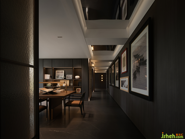 過道一側(cè)深色木飾面的包裹將立面塑造成干凈的基底,未來可以承載繪畫、手作、書法等各類文創(chuàng)作品。