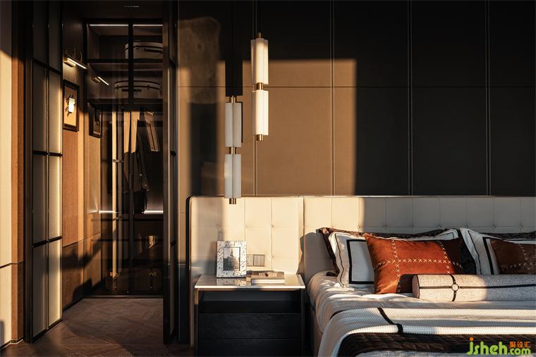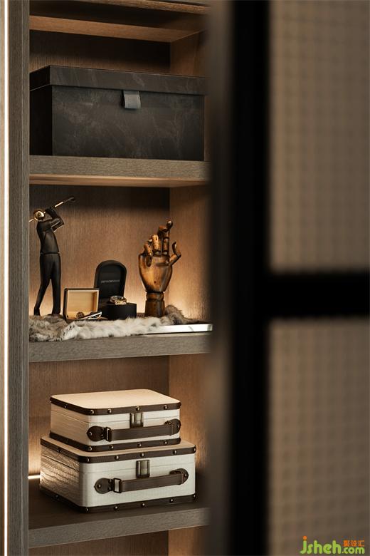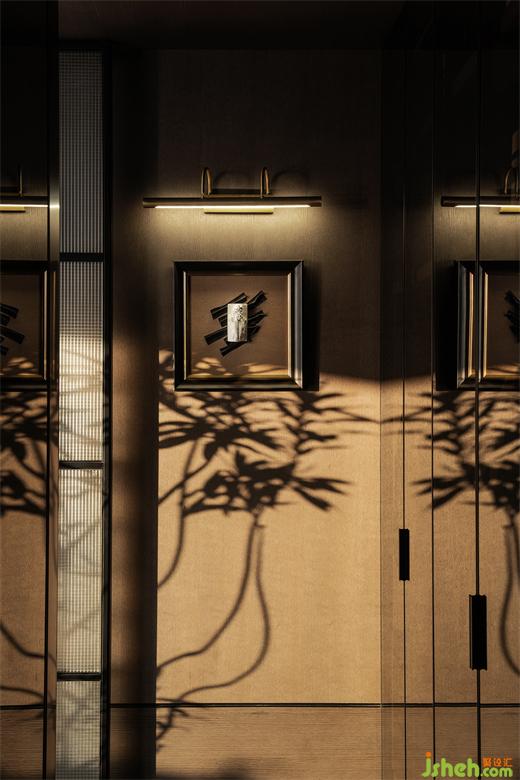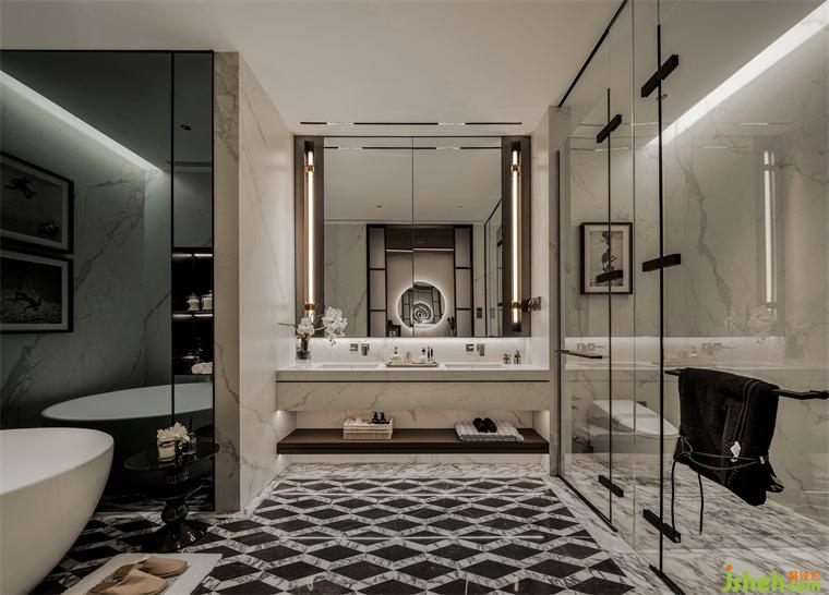 四分離衛(wèi)生間,金屬與石材的穿插,比例分配恰到好處。樣板房設(shè)計(jì)幾何拼花序列之美,在燈光的渲染下,塑造三維的視覺效果。