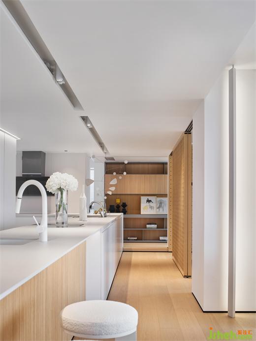 設(shè)計(jì)師以九米長的島臺(tái)為核心連接所有的公共空間,江景大平層設(shè)計(jì)視覺動(dòng)線貫穿客廳、書房、廚房、多功能區(qū)及兒童房,完美契合了業(yè)主一家人陪伴彼此的需求,實(shí)現(xiàn)一種純粹的極簡狀態(tài)。