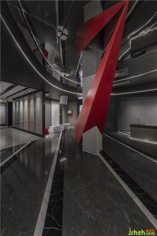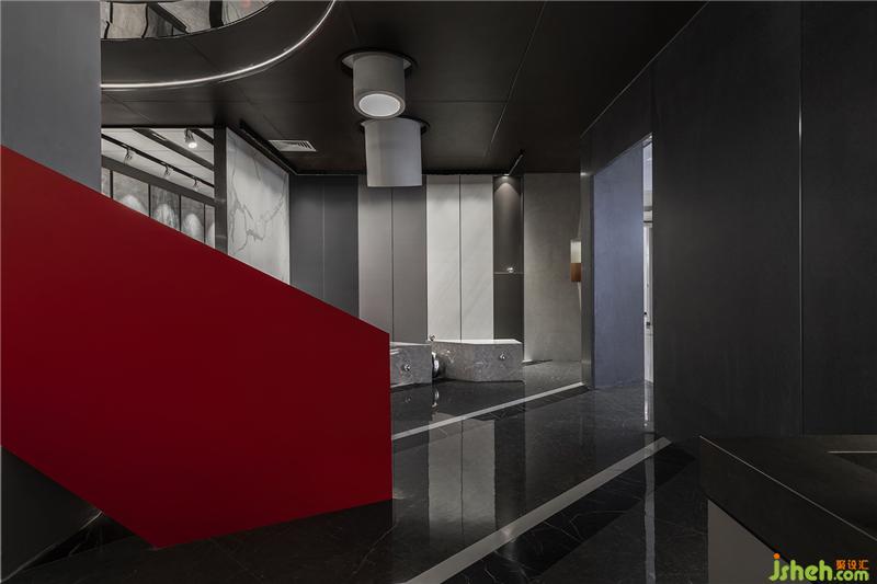 黑、灰的基調(diào)與紅色的熱烈在色彩上以對(duì)比傳遞觸覺(jué)的模擬體驗(yàn);凝練的線條和高度歸納的輪廓刻畫體積,在簡(jiǎn)約中迸發(fā)現(xiàn)代主義的力量;置于空間中部的樓梯借線條凝聚的軌跡營(yíng)造上升感,由實(shí)際形態(tài)的牽引在接受者頭腦中“建立”一個(gè)結(jié)構(gòu),喚醒記憶以模仿某種感覺(jué)。裝修公司
