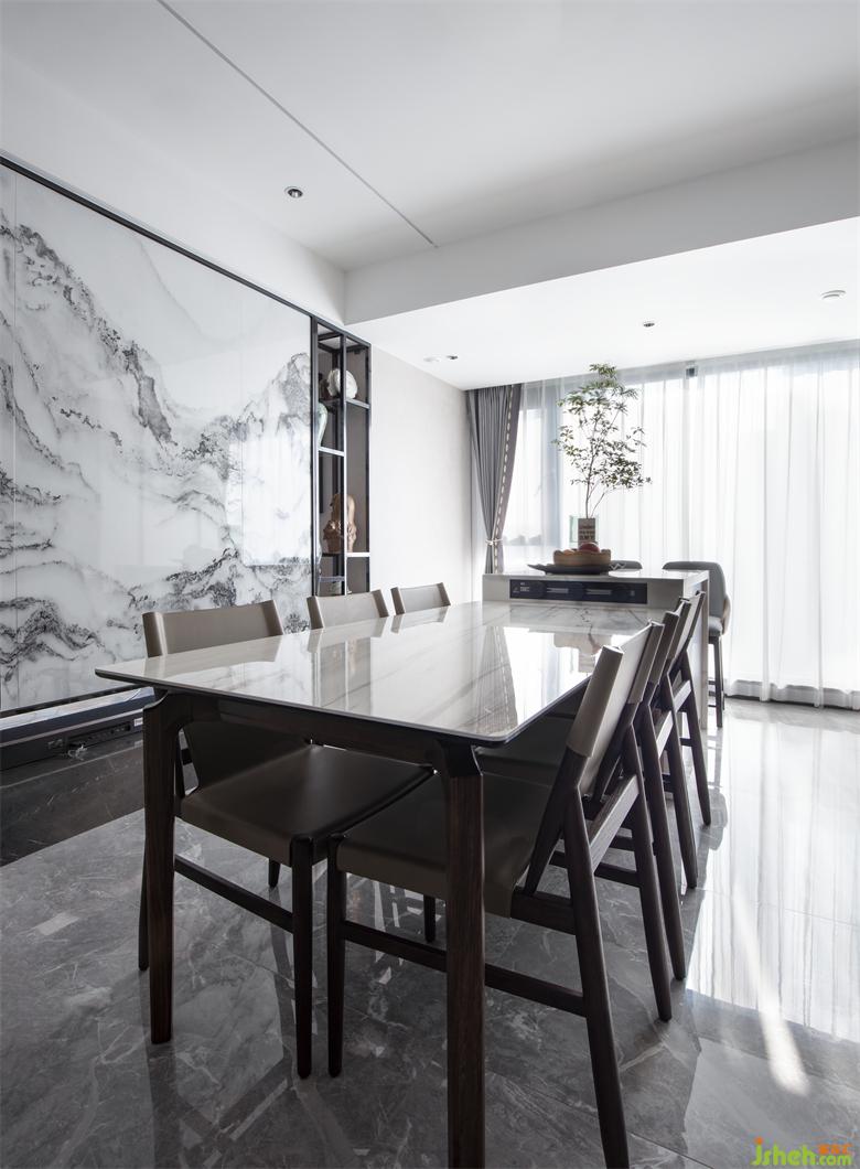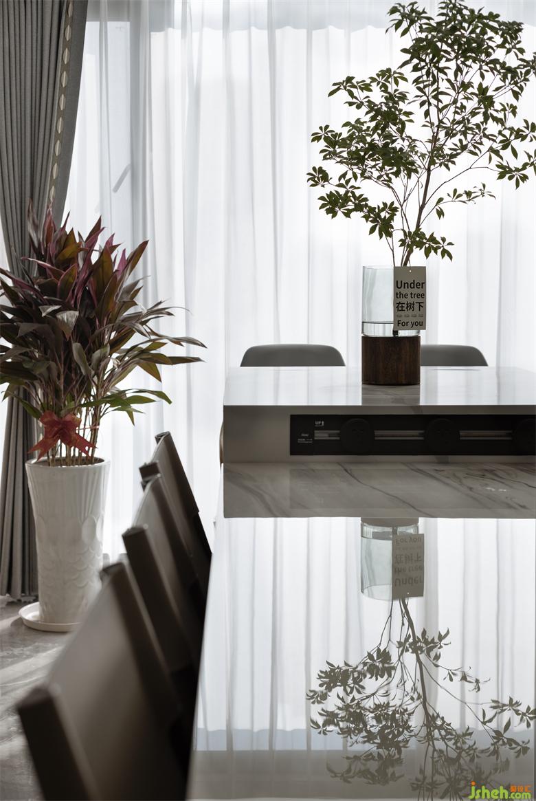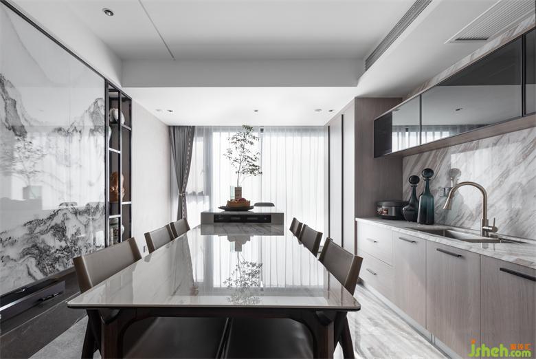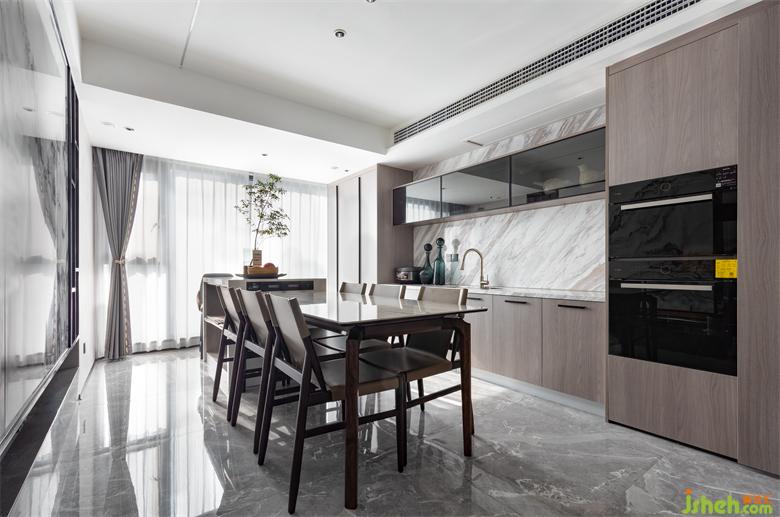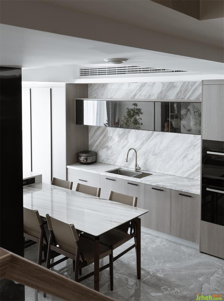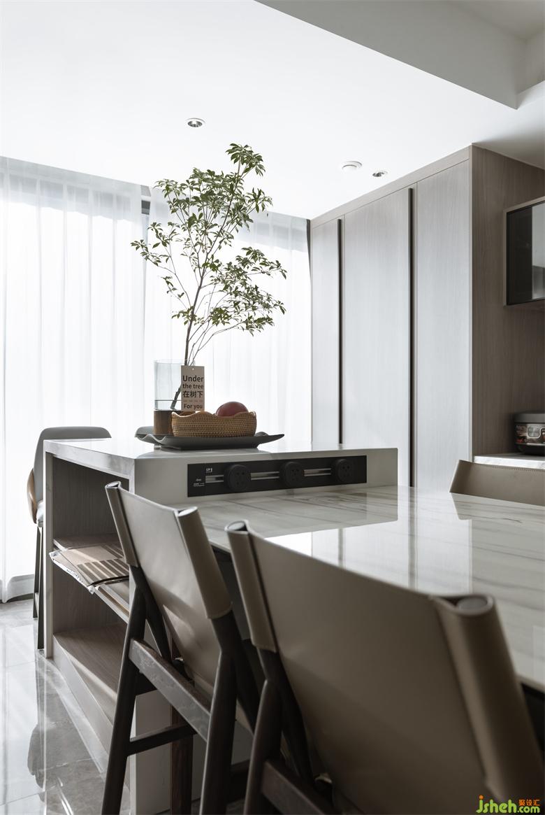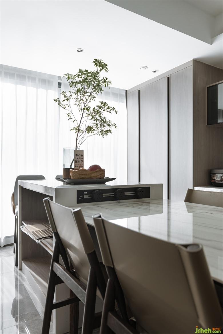 采用半隔斷的形式,使得客廳與餐廳同為一體,室內(nèi)設(shè)計(jì)師獲得空間調(diào)性活躍的優(yōu)勢,設(shè)置在這里的蒸箱烤箱也能很好滿足烘焙烹飪的需求。