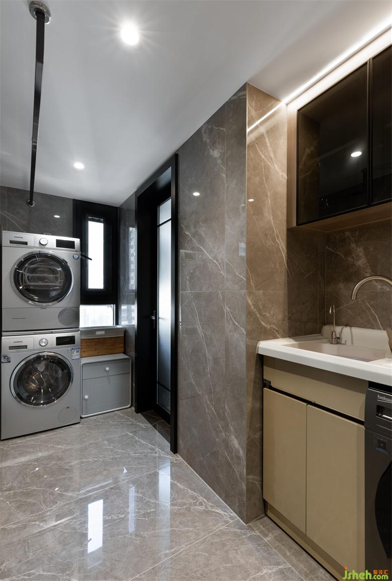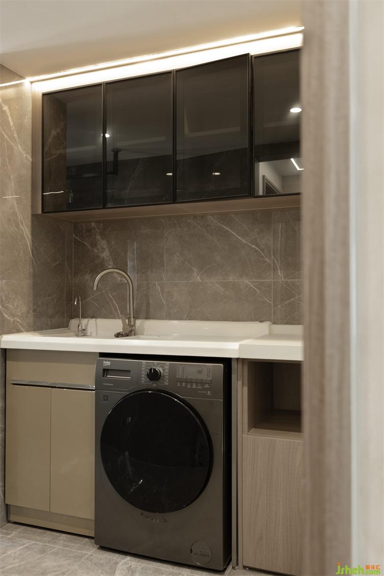 二樓家政間洗衣池,在公衛(wèi)外另外設(shè)置的洗衣機(jī)烘干機(jī),總計三臺清洗設(shè)備,很好滿足住戶的清潔需求且通過對過道的利用,一樓的生活陽臺能夠騰出空間,實(shí)現(xiàn)餐廚一體的應(yīng)用。室內(nèi)設(shè)計師