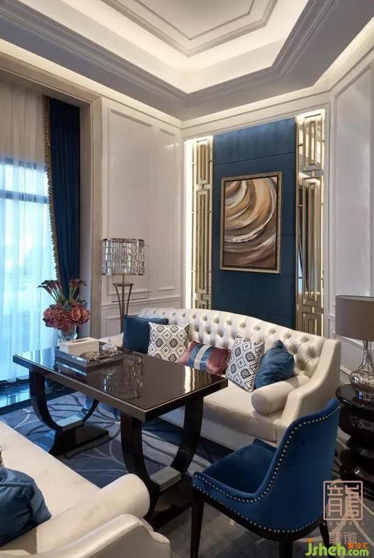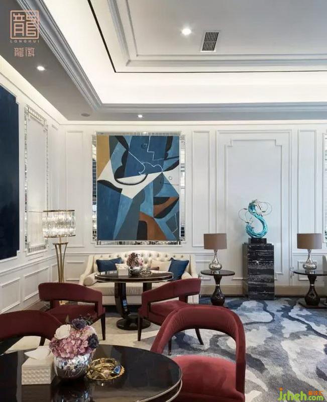 紅藍(lán)色調(diào)的交織,冷暖色調(diào)的交融,既打造出愉悅的視感,又提升了空間的品質(zhì)感。墻上的抽象掛畫里,好似兩位喝著香檳低語談笑的紳士。整個洽談區(qū)空間洋溢著歡悅輕松的氛圍,讓人迷醉其中。