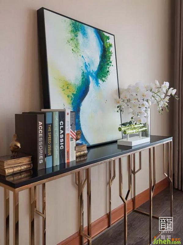 勾勒感的收邊鏡柜,既時(shí)尚又實(shí)用。窗簾、掛畫及擺件一直延續(xù)空間主題。