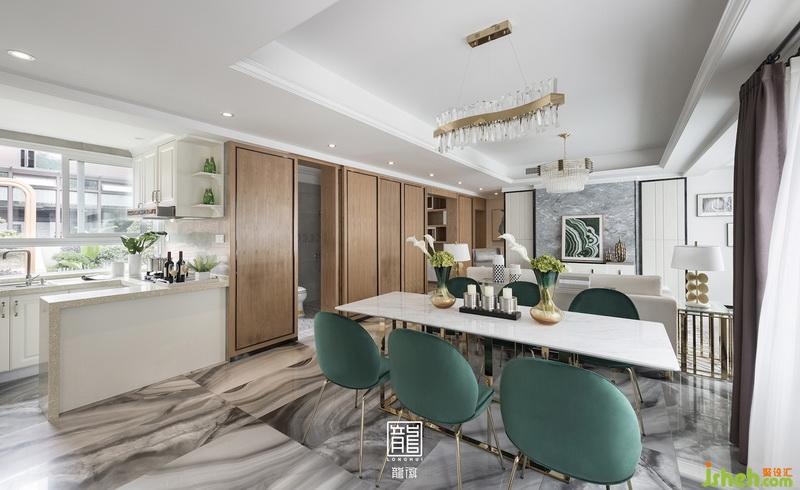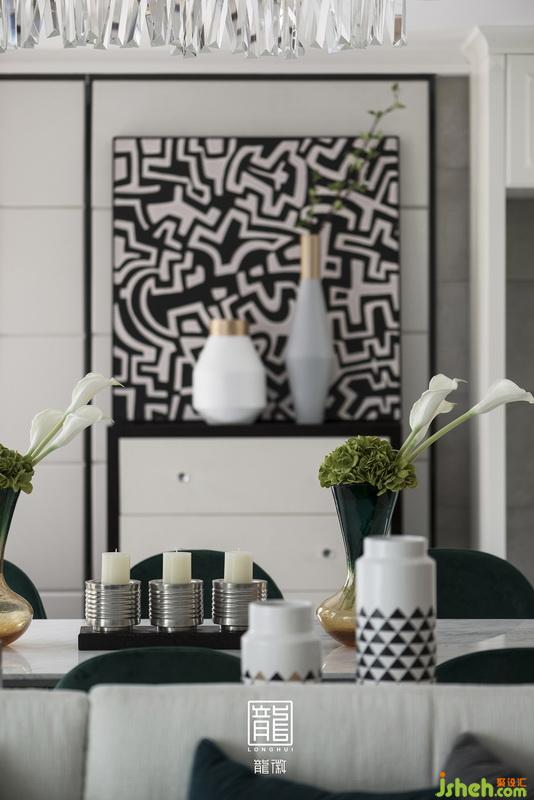餐廳的色彩和質(zhì)地是整個(gè)大空間的美好衍生,餐椅的絨面軟包室內(nèi)設(shè)計(jì)師沿用了溫柔低調(diào)的森林綠,搭配雅士白大理石餐桌,帶來了十分愜意的用餐感受。