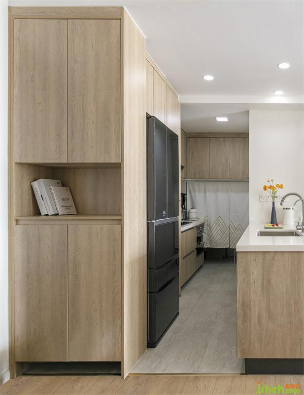 入門就是客廳,沒有玄關(guān),鞋柜與廚房的儲物高柜一起定制的。鞋柜的黃金比例就是做到頂,留中空放置出門常用品,底部留空15-20cm放置居家拖鞋。