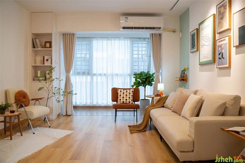 客廳封了陽臺,延伸了客廳的面積,地面的材質是瓷磚與地板拼接。