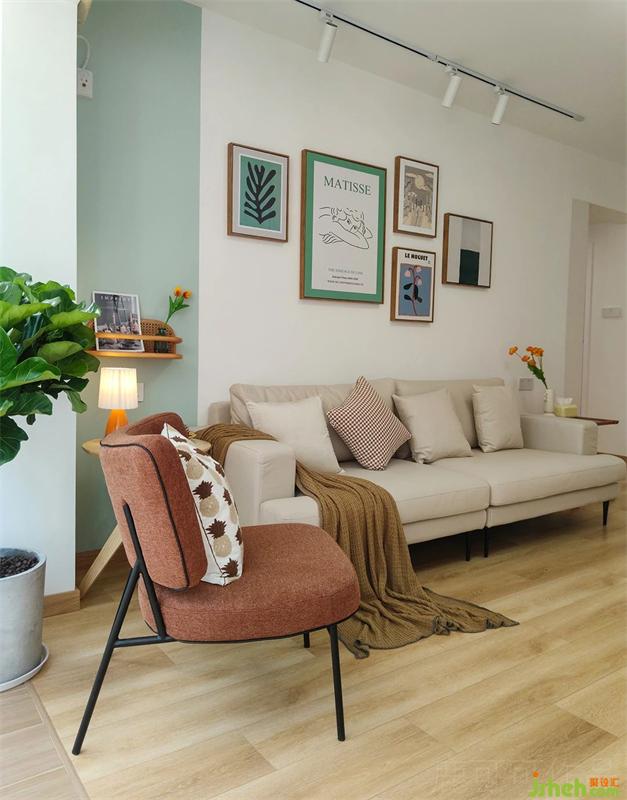 左面的背景墻留了一抹薄荷綠,與馬蒂斯這幅畫的留白綠框相呼應,搭配了蜜糖紅的單人位沙發(fā),使清爽的客廳增添了一份活潑的氛圍。