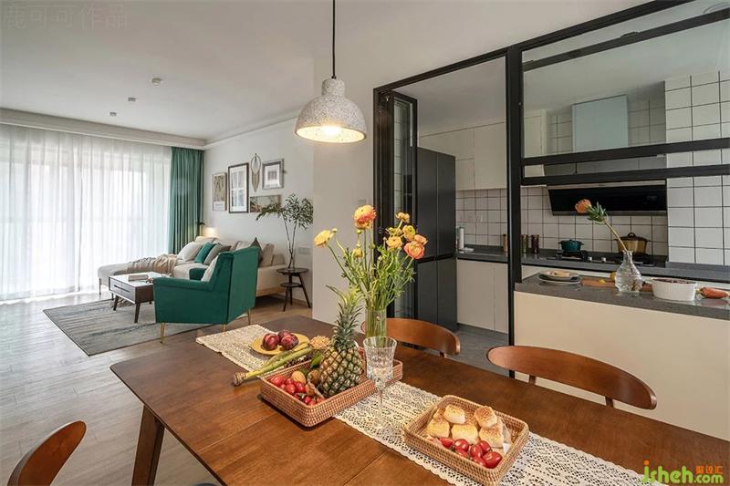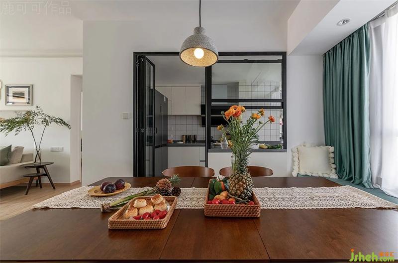 餐廳的餐桌是溫潤的胡桃木材質(zhì),可伸縮,根據(jù)就餐人數(shù)自由調(diào)整??ㄗ洗钆涞拇昂熍c客廳的是一致的,前后呼應(yīng)。餐廳看向廚房,家人下廚的身影,日常的對話,都是生活點(diǎn)滴中的幸福。