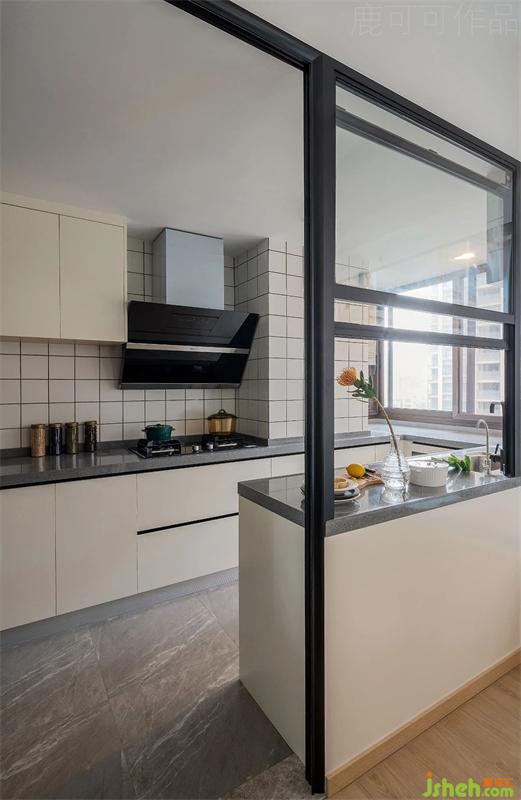 半開放式廚房,用折疊門代替常用的推拉門,使空間更開闊,設(shè)計了使用率最高的G型廚房,與餐廳相連處沒有做隔墻,以島臺的形式做了地柜,上面是操作臺面,搭配了不占空間的上下推拉窗,日常洗菜切菜都可與餐廳的家人交流互動,不會有在廚房埋頭做事的孤獨(dú)感。