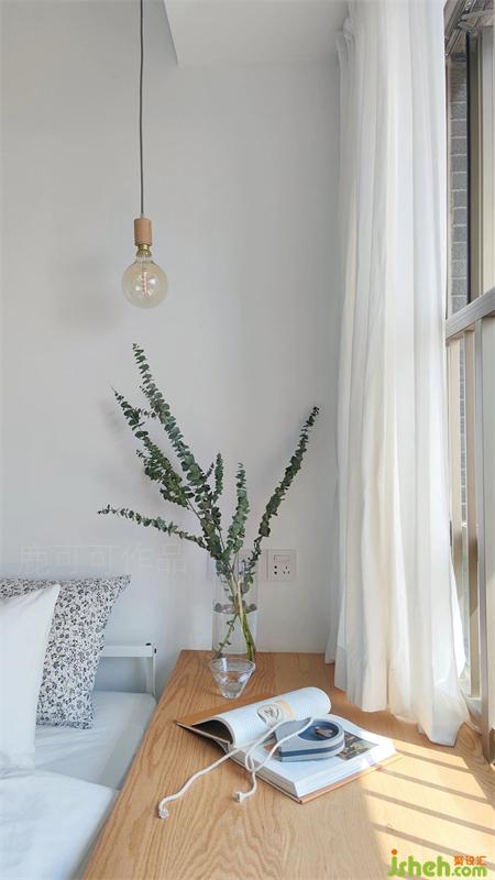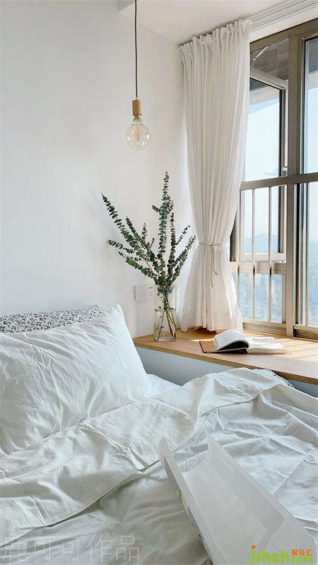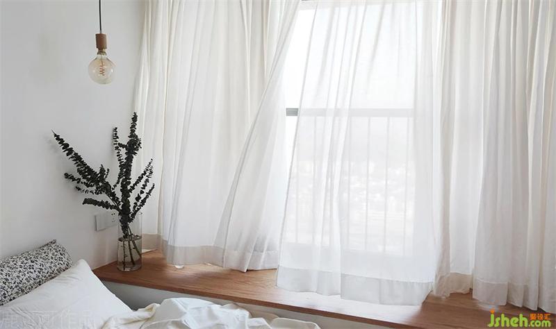 臥室是無主燈設計,整體是溫柔素雅的氛圍,實木飄窗點綴提升溫馨感。床頭背景沒有掛裝飾畫與墻飾,KK說以后旅行時慢慢淘自己喜愛的具有紀念意義的掛畫。