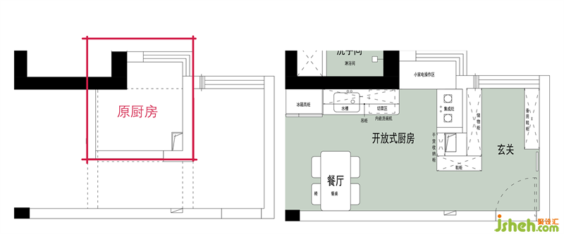 原廚房改造之前處于玄關(guān)與餐廳的中間,雖然有窗戶,但采光不強,加上兩邊是櫥柜與冰箱,進入廚房會比較逼仄。