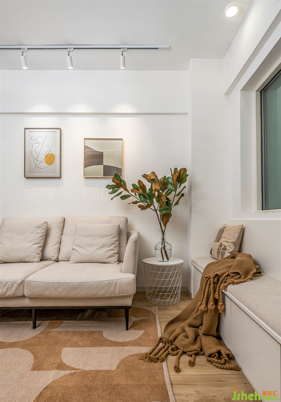 客廳沙發(fā)旁邊有一個承重柱,深度是420毫米,齊平柱子的厚度做了一個收納卡座,下面做了可以儲藏客廳收納物品的無把手抽屜,由于空間的限制客廳沒有擺放單人位,長度達(dá)2米的卡座可兼顧朋友聚會時坐。