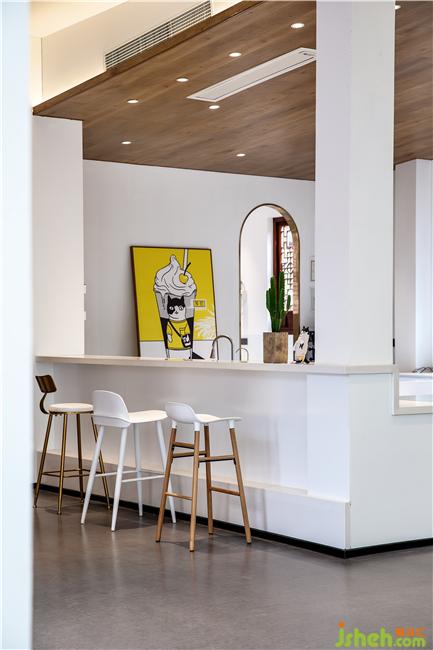自然陽光透過落地玻璃引入空間,使得每一個空間都變得明亮并溫馨,傳統(tǒng)材料的創(chuàng)新應(yīng)用,現(xiàn)代環(huán)保的措施。素水泥,老榆木,老船木等舊材料與玻璃,黃鈦金不銹鋼,白色烤漆板等新材料之間的碰撞與融合帶動空間的靈動性。內(nèi)部空間中大量的舊材料利用,我們設(shè)計成了家具及貓屋提高了廢物的再生性及環(huán)保。文創(chuàng)設(shè)計
