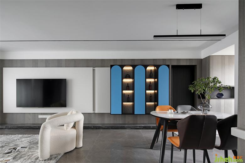 The design of the living room is simple and clean, showing relaxed, natural and comfortable. In the space, the simple light strip and TV wall have clear lines,Dotted red and blue interweave a warm atmosphere, making the artistic conception of home more comfortable and interesting.