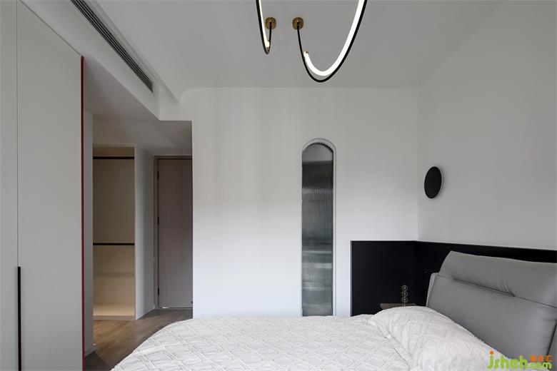 臥室內(nèi),床頭墻面的設(shè)計(jì),白色與黑色各占半壁,互相中和了彼此的色彩,家居設(shè)計(jì)讓空間處于一個(gè)最具平衡的狀態(tài)。