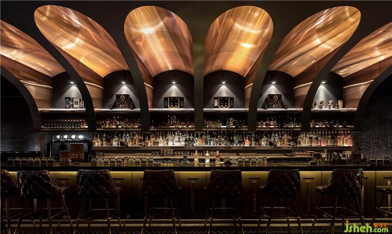 概念源自于制作威士忌的原料(大麥),本空間以“大麥”為主要提煉元素,先由單一的自然形態(tài)到組合裂變形態(tài),再由“繁”至“簡”轉(zhuǎn)換形態(tài)并植入到以酒吧中部為核心的主酒架區(qū)域,突出為之相聯(lián)的主題。泛金色的金屬質(zhì)感融入到整體空間中,進一步體現(xiàn)威士忌的固有色,并在燈光的映射下顯得流光溢彩,光影之間猶如半畝方塘一鑒開,天光云影共徘徊。酒吧設(shè)計