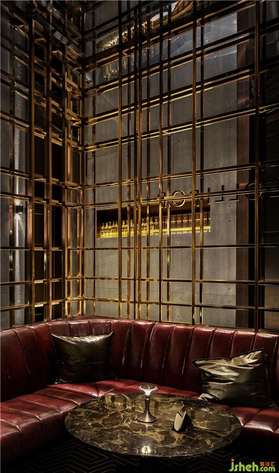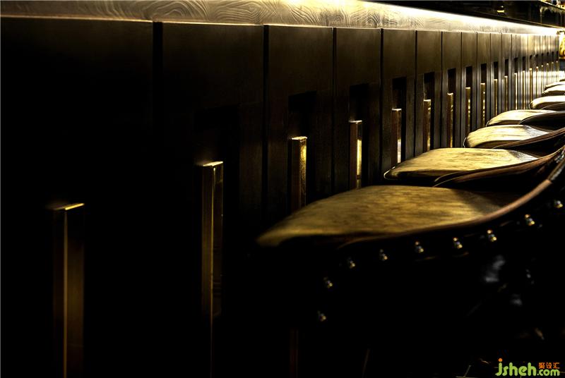 ▼酒吧局部,泛金色的金屬質(zhì)感融入到整體空間中