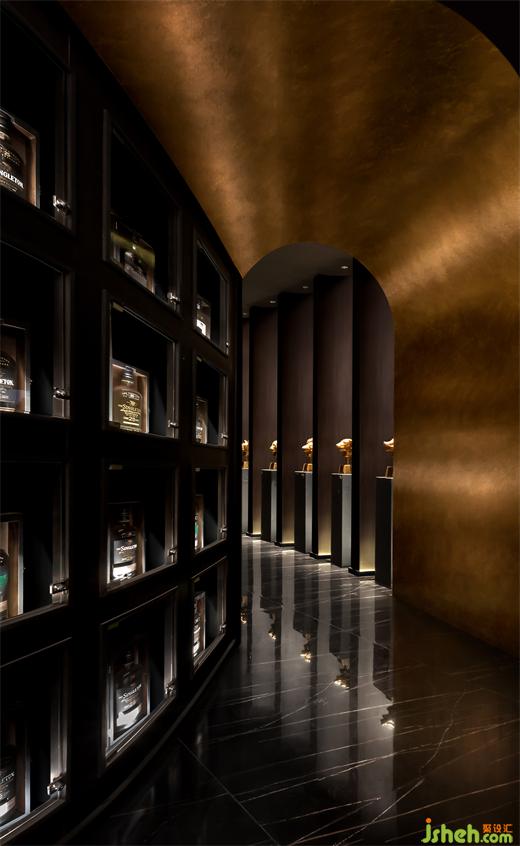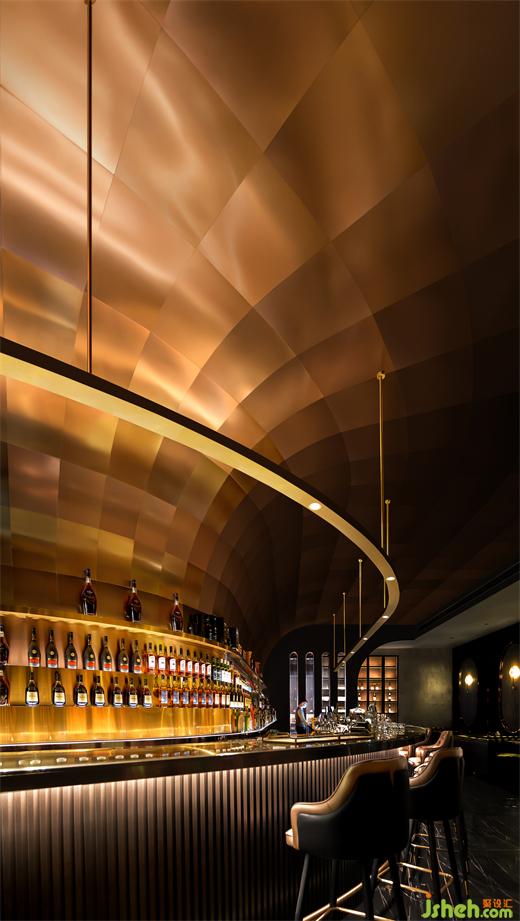 空間中心處,以威士忌酒中固有色的“金色原漿”為藝術(shù)原型,深圳酒吧設(shè)計(jì)以水為題,意為一尺水,百丈波,滔滔不息,使韻律及活力得以在空間中傳遞,同時(shí)也象征著新生。喻比莊子筆下《逍遙游》水擊三千里,摶扶搖而上者九萬里。