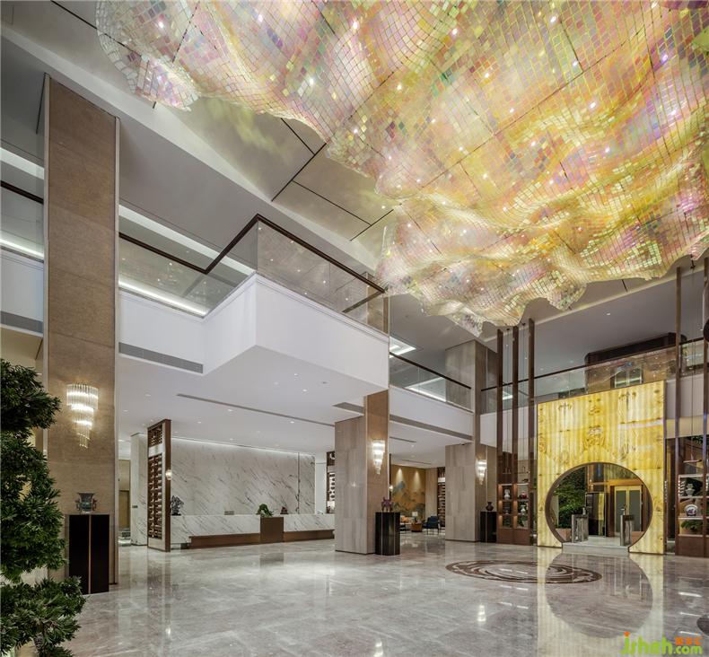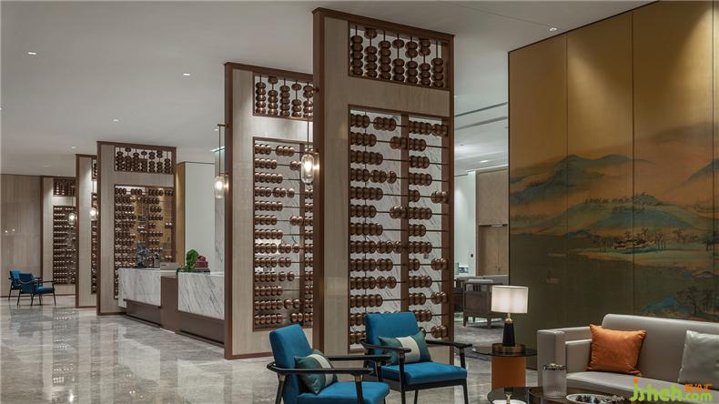 進(jìn)入大堂映入眼簾是凌空壯似涌動(dòng)著的水晶吊燈映襯于空間中,似星光點(diǎn)點(diǎn),璀璨斑駁。裝修設(shè)計(jì)算盤式的隔斷屏風(fēng)分隔了大堂與休息區(qū),木質(zhì)算珠成串鋪排,極具古樸典雅。千里江山圖在沙發(fā)區(qū)背景靜靜流淌著光彩,組成一個(gè)大空間的基調(diào):一虛一空靈,一實(shí)一莊重。配合著大廳播放的“千里江山圖”及新東方企業(yè)兼顧人文文化及企業(yè)文化的介紹宣傳,調(diào)動(dòng)著視覺感官和聽覺感官。