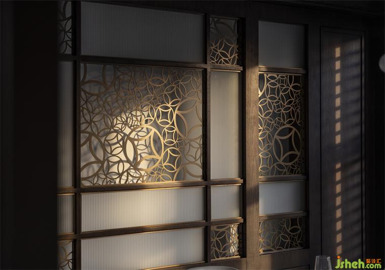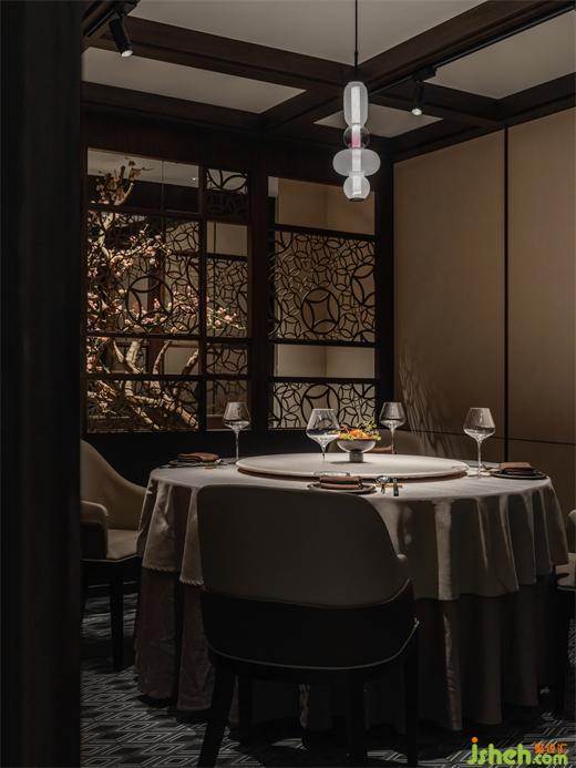 北京餐廳設(shè)計(jì)傳統(tǒng)錢(qián)紋經(jīng)過(guò)改良,大量應(yīng)用在窗格和立面隔斷上。紋樣外圓內(nèi)方,環(huán)環(huán)相扣,排布靈動(dòng),既保留了吉祥寓意又掙脫了古板的舊形式,燈光透窗在室內(nèi)各處形成迷人的投影。