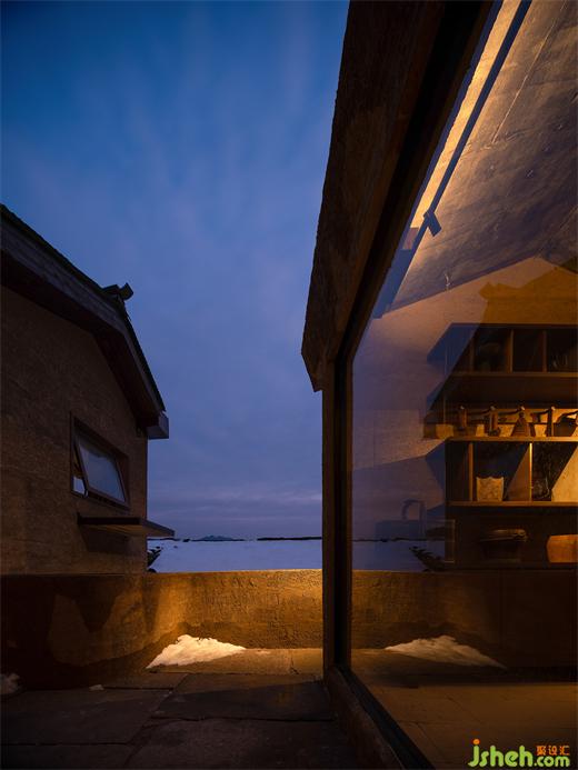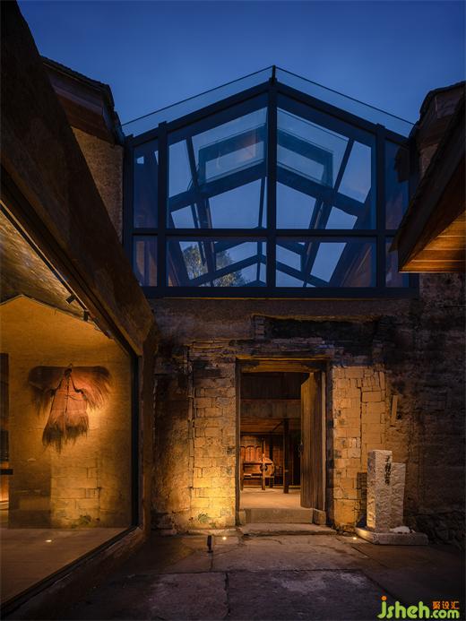 建筑坐落于陳家鋪村最為熱鬧的地段之一,從山頂俯瞰,很輕易就能憑借玻璃天頂?shù)脑O(shè)計特征聚焦到它的所在。博物館設(shè)計澄澈剔透的一方天頂如一面旗幟般書寫陳家鋪村的“新地方志”。它給予了村莊第一個可以停留的公共空間,也將村子的日常生活與文脈呈現(xiàn)給遠道而來的人。
