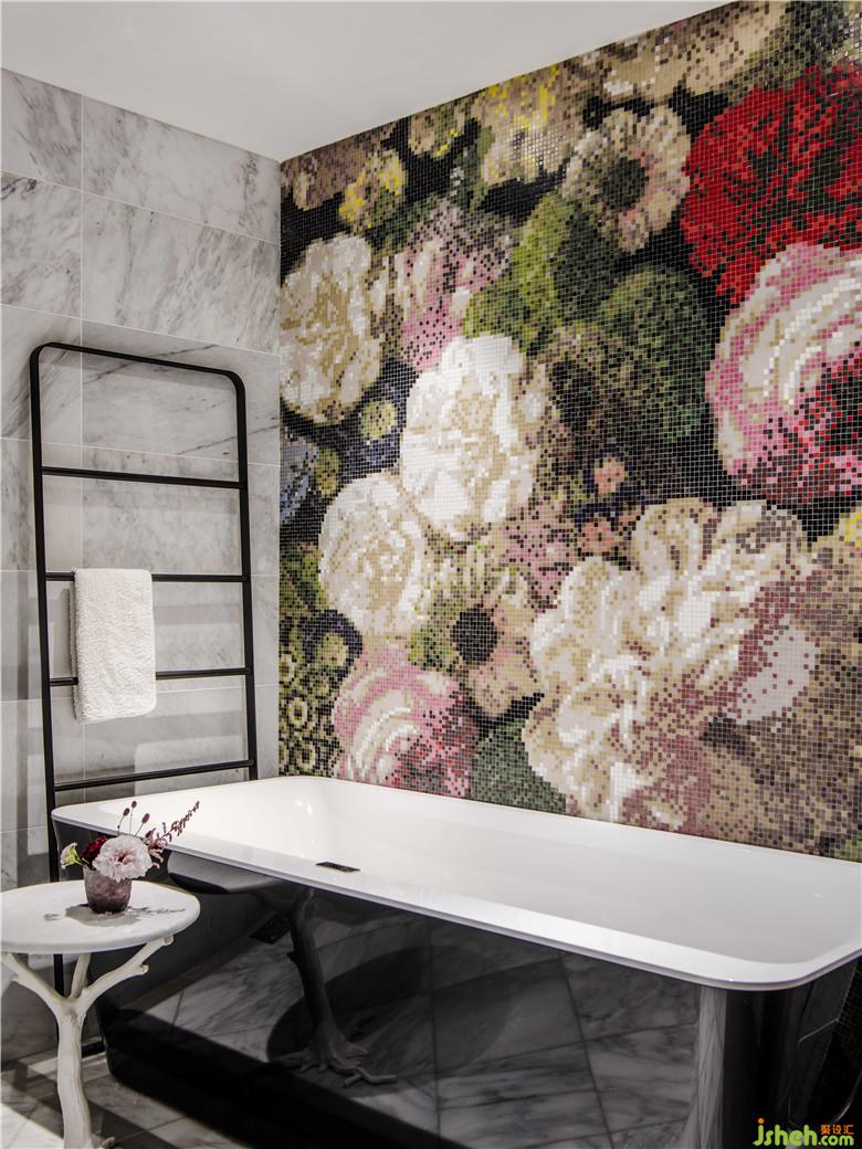 一整面墻的花朵馬賽克是衛(wèi)生間里的亮點,配合香氛設計,從視覺和嗅覺上給人宛若躺在花叢中沐浴的感覺,仿生設計貫穿整屋。