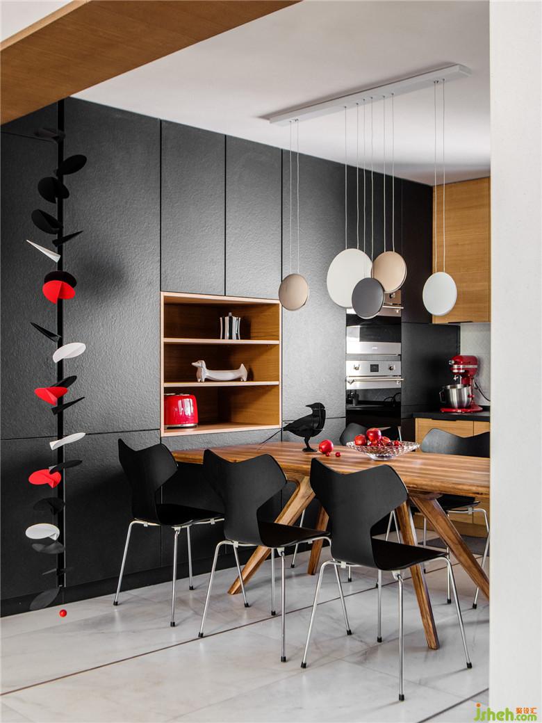 我熟諳創(chuàng)造溫暖氛圍的技巧,在這里我用了黑色板巖材質(zhì)的墻面和餐椅,搭配木質(zhì)的餐桌和柜體,顯得相得益彰,有著細(xì)膩的做工和上乘的材質(zhì)。用餐的時光不再那么單調(diào),餐廳和西廚的結(jié)合,讓下廚成了家人互動的地方。