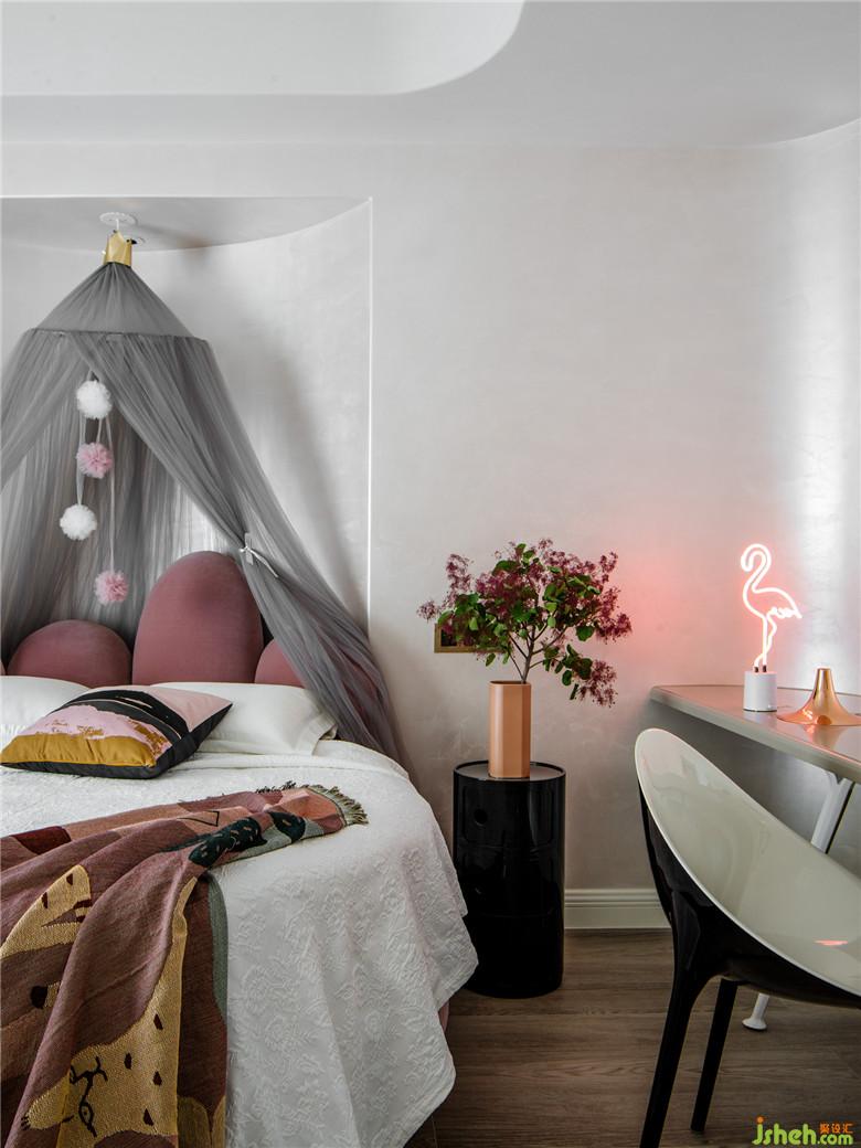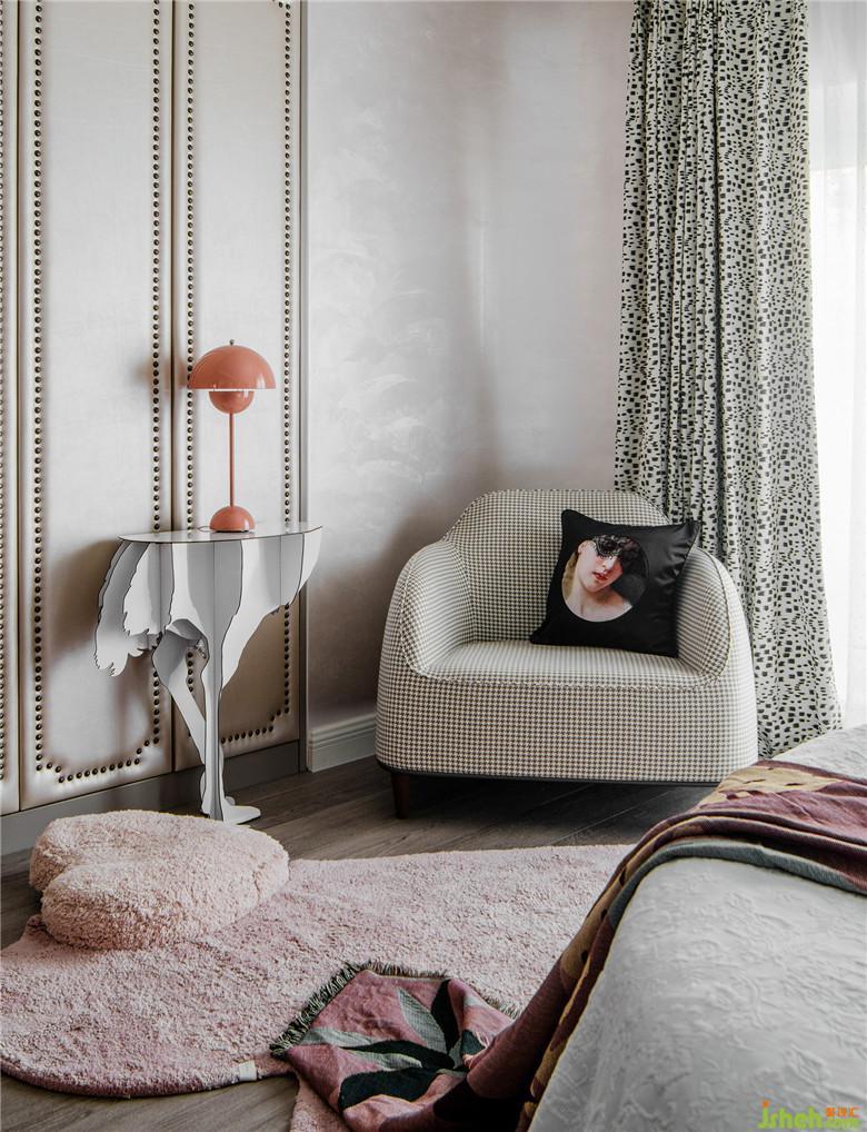 墻角的弧線處理與陽臺呼應,一氣呵成,很簡約的細節(jié)設計對房間的采光有著意想不到的效果。相比白墻,藝術(shù)漆肌理墻面可以將物品的光彩放大。皮粉色的床和地毯,為空間賦予個性和溫度。