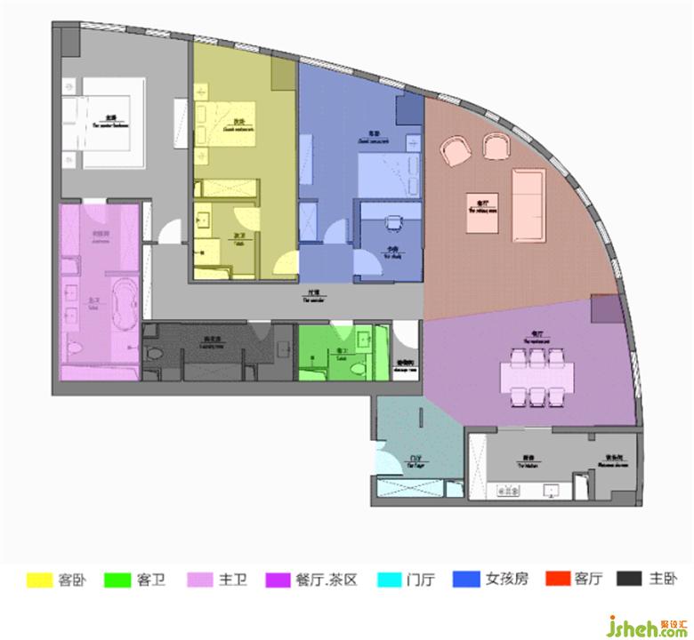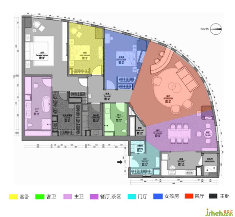 1、把空間從固有扇形結(jié)構(gòu)的束縛中解放出來。平面呈扇形,室內(nèi)大量弧形和非垂直的轉(zhuǎn)角對(duì)空間的利用造成諸多限制,按照慣性思維,是無論如何都會(huì)出現(xiàn)讓角落閑置的情況。但是,我們堅(jiān)信206平方米的不算小的面積為解決難題提供了可能性。