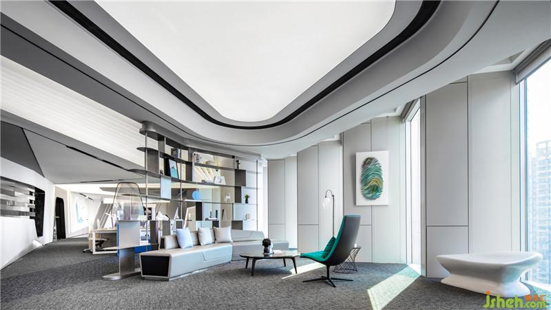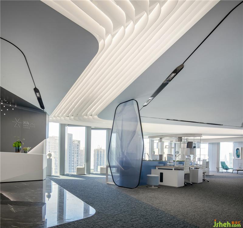 在設(shè)計(jì)語(yǔ)言表達(dá)方式上,設(shè)計(jì)師以簡(jiǎn)潔的白色折線形態(tài)做為空間的主導(dǎo)元素,以游動(dòng)、穿透、回旋與韻律作為空間的主題,起伏的白色亞克力天花折面造型以其簡(jiǎn)約的線條和充滿未來(lái)感的設(shè)計(jì)語(yǔ)言勾勒出兼富有節(jié)奏且兼具人文感和科技感的共享立體空間。而空間里深色石材與淺色地毯的序列排布,則以厚重感與輕盈白色天花頂?shù)目侦`相依存,輕盈且富有空間張力,進(jìn)一步打造出空間的層次與韻律。公區(qū)、玻璃窗邊可拼接組合椅及軟裝藝術(shù)品的陳列,每一處都變成設(shè)計(jì)的誘導(dǎo)者,引領(lǐng)來(lái)訪者的好奇心,直至抵達(dá)下一個(gè)空間情境。設(shè)計(jì)公司