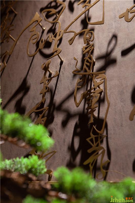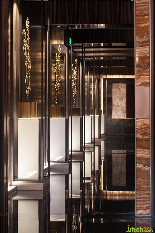 作為會(huì)所的第一空間,設(shè)計(jì)為確保私密性所規(guī)劃的左右對(duì)稱通道路徑布局,在地面暗藏光源中以其內(nèi)斂沉靜的場(chǎng)景營(yíng)造過濾掉了外部的喧鬧與繁雜。玄關(guān)處通過現(xiàn)代石材表現(xiàn)的東方意味——“天圓地方”,在燈光的渲染中形成了“幽竹山窗下” 的詩意。獨(dú)創(chuàng)《陶朱公 商訓(xùn)》藝術(shù)書法雕塑與不銹鋼序列結(jié)構(gòu)天花間的相互呼應(yīng),在傳達(dá)了企業(yè)溫厚穩(wěn)重的人文印象的同時(shí)也為這無限的意境中做足了視線延伸。而每個(gè)房間門口的造型各異的燈具則以其溫潤(rùn)之光靜候貴賓,營(yíng)造出淡然氣韻。設(shè)計(jì)公司