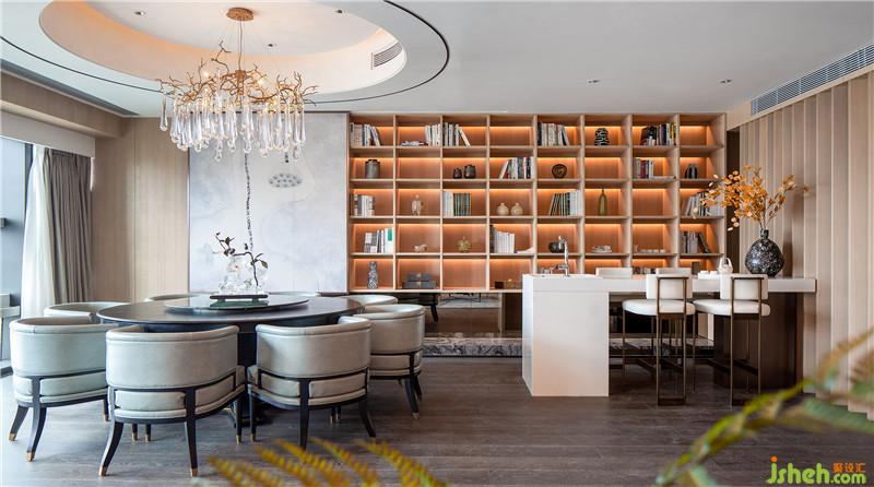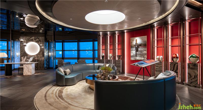 在這個(gè)項(xiàng)目的設(shè)計(jì)中,我們一直在尋求不被形式所界定的風(fēng)格。同時(shí),我們也認(rèn)為對(duì)于高凈值人群而言,獲得身份認(rèn)同感與精神歸屬感的體驗(yàn)互動(dòng)才是精準(zhǔn)化營(yíng)銷。故在集商務(wù)、閱讀、娛樂(lè)與休閑功能為一體的行政酒廊區(qū)域,我們以圖書(shū)室為主題概念,特設(shè)閱讀墻來(lái)展現(xiàn)企業(yè)和企業(yè)家精神層面的內(nèi)涵力量,打造思想交流與碰撞的理想地。同時(shí)天花以灰鏡做頂,在高度有限的空間里以達(dá)視覺(jué)通高效果,加深空間體驗(yàn)感。紅色背景墻的植入,是熱情承載別有風(fēng)致的現(xiàn)代美學(xué)意涵,而休閑區(qū)里可自由組合的圓形沙發(fā),則給予空間更多的可能性。設(shè)計(jì)公司