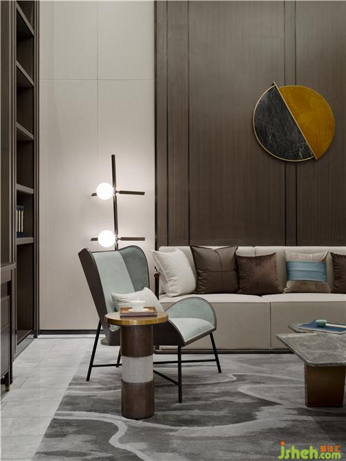 無論是從其呈現(xiàn)的風(fēng)格美學(xué),還是賦予人的極致體驗(yàn),呂邵蒼設(shè)計(jì)在人文生活情景上的深度打磨都值得贊嘆。在負(fù)二層會(huì)客廳,設(shè)計(jì)師賦予空間場景以靈動(dòng)的詩意 —— 一池春水匯于線條蜿蜒的捫布之上,與蒼翠的松樹端景、不規(guī)則走線的雅灰地毯形成虛實(shí)的映襯,以一種返璞山水與林間的自然意境,實(shí)現(xiàn)私密會(huì)客、親朋暢聚的休閑空間。