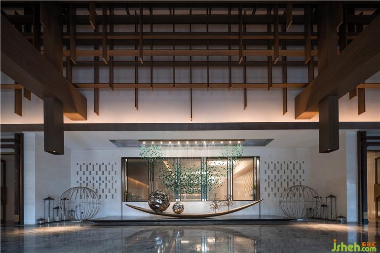 幸得泰興古城的和水風光蔭庇,本案以富有當地舟船特色的造型作為初入門廳的主題設計方向。水療設計門廳的整體框架仿照了船艙內的木質結構、以橫縱骨架為梁,迎賓處一楫悠然小船,搭配松枝、碧玉、水滴的自然元素,將自然氣韻融合現代的設計手法,勾勒出靜水深流的氛圍。