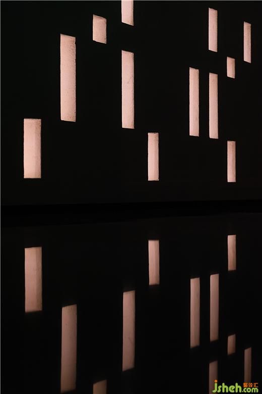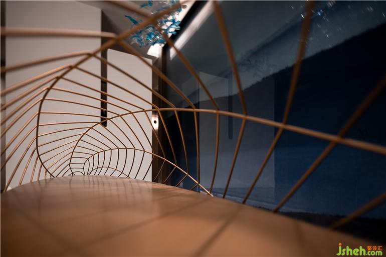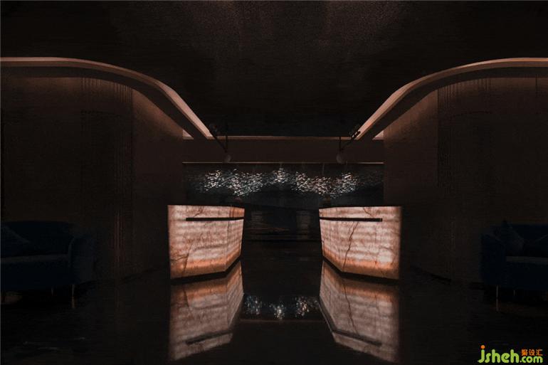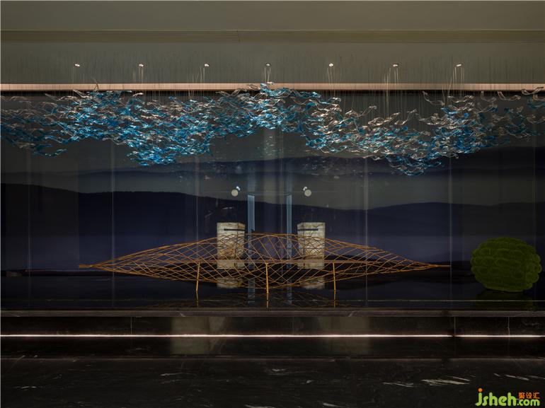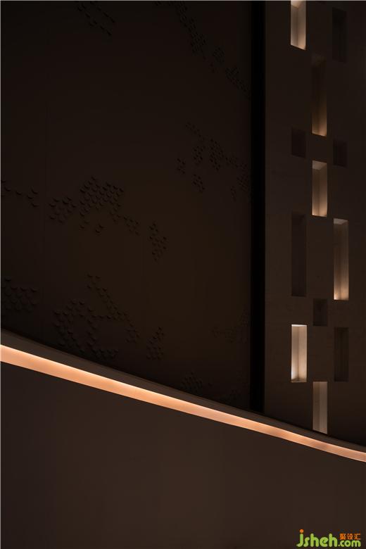 如乘船緩入,等候區(qū)域的走廊則更加深了江河暢流的觀感。兩側的燈帶似是河岸聳立,光影的投射中,悠長而靜謐的河道徐徐向遠。水療設計精巧鍍金鋼絲工藝的藝術裝置似扁舟一尾、又如落木一葉,在霧靄沉沉的山水背景里,隨漫天星霜而搖曳。