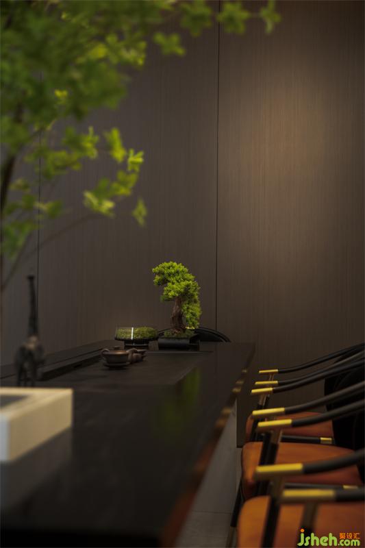 JUN用現(xiàn)代的材料與傳統(tǒng)的設(shè)計(jì)元素來演繹出富有建筑的古樸和端莊,也表現(xiàn)出一派安靜而祥和的景象,品茶區(qū)背景的折疊屏風(fēng)借鑒了輞川圖的山水建筑,墻面的造型提取了山的元素,通過現(xiàn)代的材料跟藝術(shù)裝置的手法來表現(xiàn),形成獨(dú)特的空間體驗(yàn)。