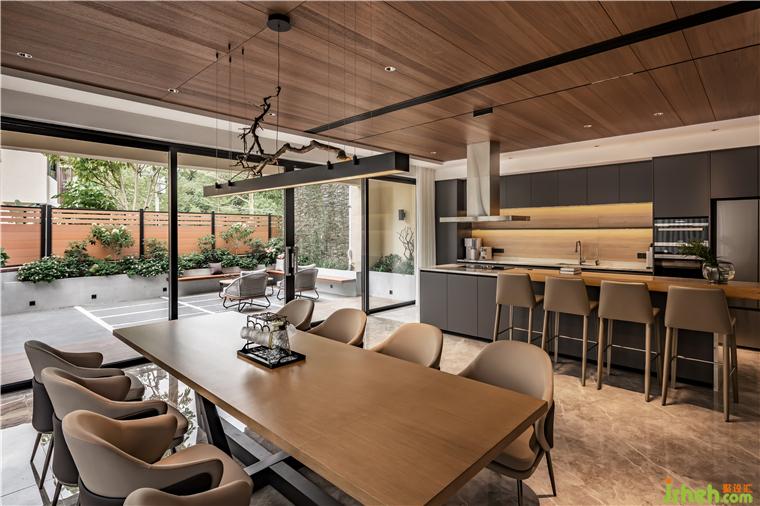 餐廚區(qū)與戶(hù)外花園相連,下沉式花園設(shè)計(jì)可以讓采光最大化地引入到負(fù)一層室內(nèi),戶(hù)外綠植與自然環(huán)境相映成趣,戶(hù)外木板凳與花池連成一體,錯(cuò)落有致。室內(nèi)室外邊界模糊,內(nèi)外延伸,引景入室,佛山保利云上別墅裝修設(shè)計(jì)師認(rèn)為,這就是展現(xiàn)室內(nèi)建筑最好的姿態(tài)。