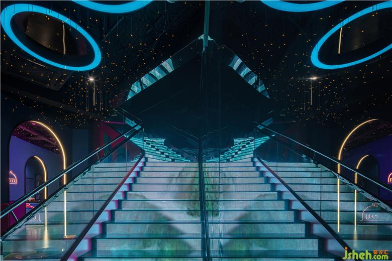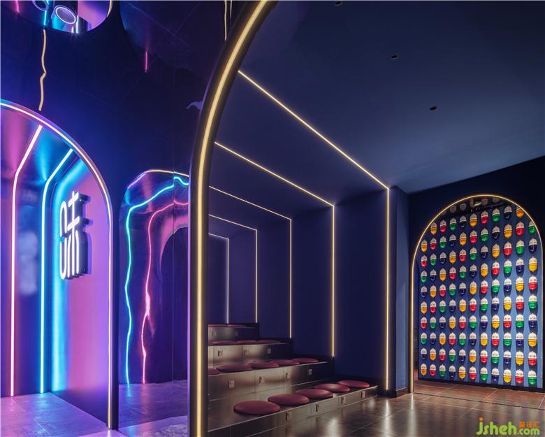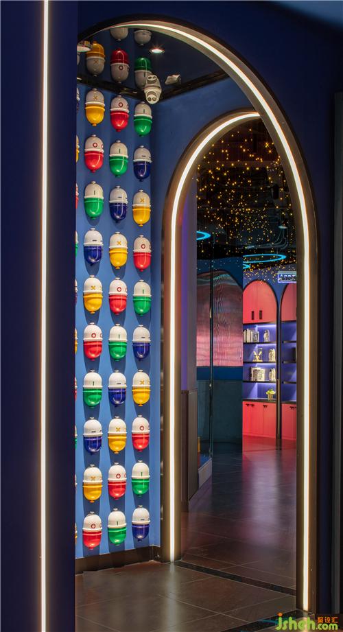 入口從品牌的機(jī)器人形象中提取出圓弧形元素,結(jié)合四周環(huán)繞的鏡面不銹鋼材料,帶給人們一種神秘跟未知感。彩色發(fā)光燈帶的運(yùn)用,打造甜蜜歡樂的視覺感受的同時(shí),呈現(xiàn)出場(chǎng)景的儀式感和迷幻感。