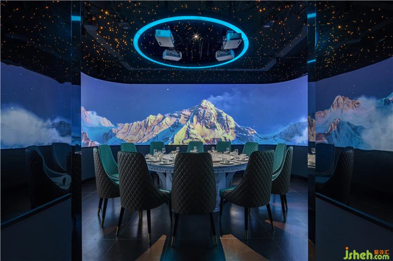 包廂頂面運用光纖燈,增強空間的視覺氛圍。極具未來感的全景360度立體投影,通過聲光電科技打造“沉浸式”就餐環(huán)境,為顧客呈現(xiàn)出了繽紛多元且富含戲劇性的視覺效果。
