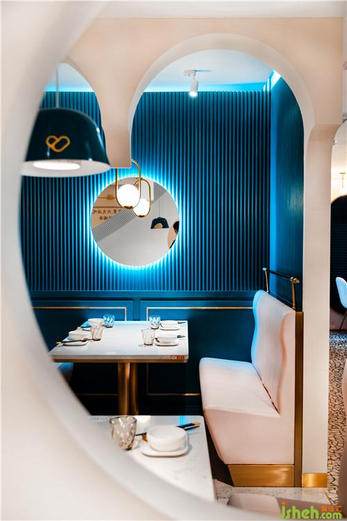 卡座區(qū)延續(xù)了整個(gè)空間的色調(diào)和材質(zhì),球形燈飾由天花順著孔雀藍(lán)色墻面灑下斑駁的光影,奠定了沉穩(wěn)的空間基調(diào)。