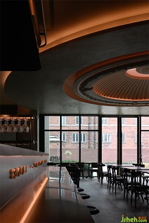 當(dāng)暮色余暉自落地窗角消散,晚間特有的燈光恰如日光與月色的輪轉(zhuǎn),映照出區(qū)別于日間的溫柔。餐廳設(shè)計采取日咖夜酒的經(jīng)營模式,為消費者在不同時段提供了更豐富的選擇。藍(lán)色的穹頂光與西方藝術(shù)中罕見的滿月相對應(yīng),將古典文學(xué)語境下的詩意與美感具化于現(xiàn)實。