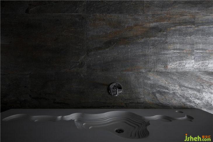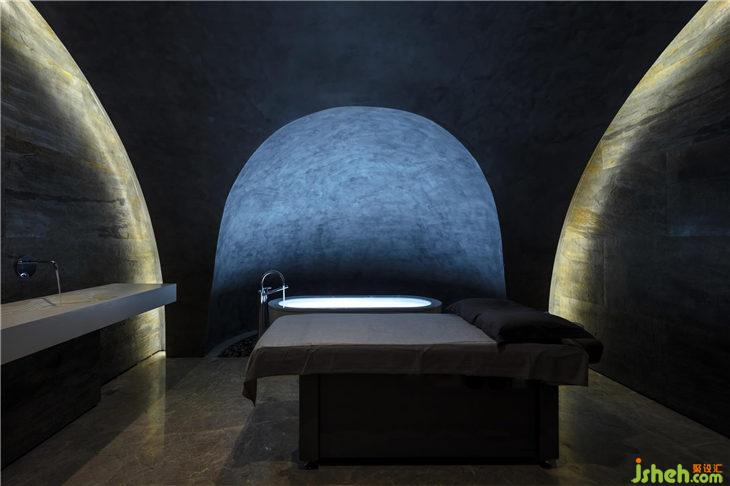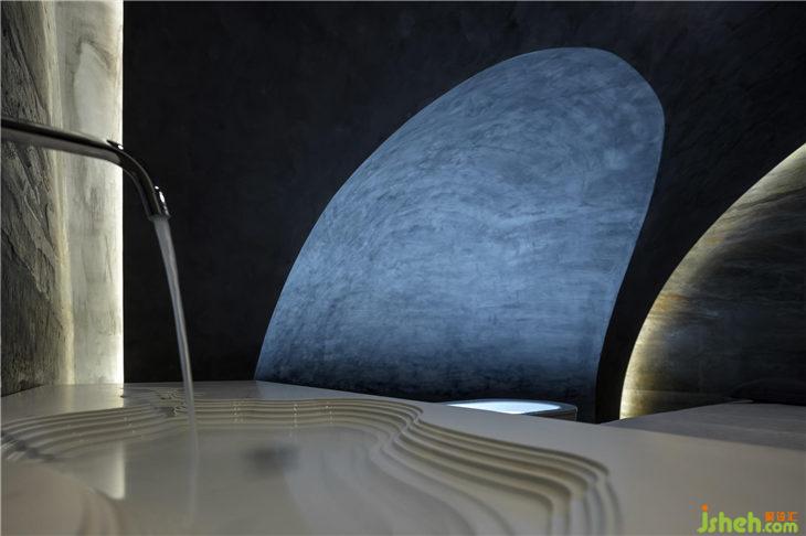 他將SPA區(qū)的設(shè)計原型定為地底溶洞,以深邃懸浮的震撼自然之景打造室內(nèi)空間,塑造出有形立體的混凝土立面。曲線雕刻的立面形體持續(xù)延伸,深沉地“懸?!庇诘孛嬷?,照明又增強了這種建筑張力,猶如置身溶洞。